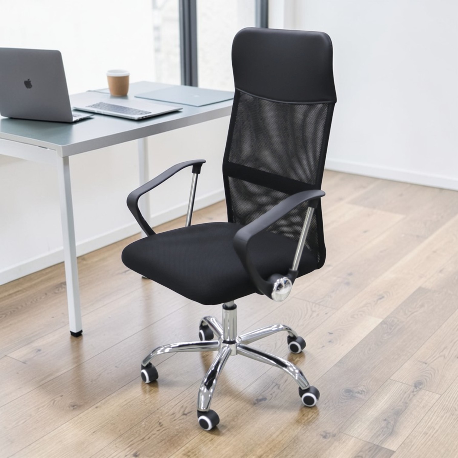 •  Комфорт и поддержка: Мягкое сиденье из черного кожзама и эргономичная спинка гарантируют удобство в течение всего дня.
