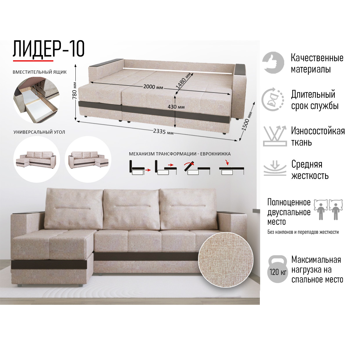 "Лидер 10" - универсальный компактный угловой диван.